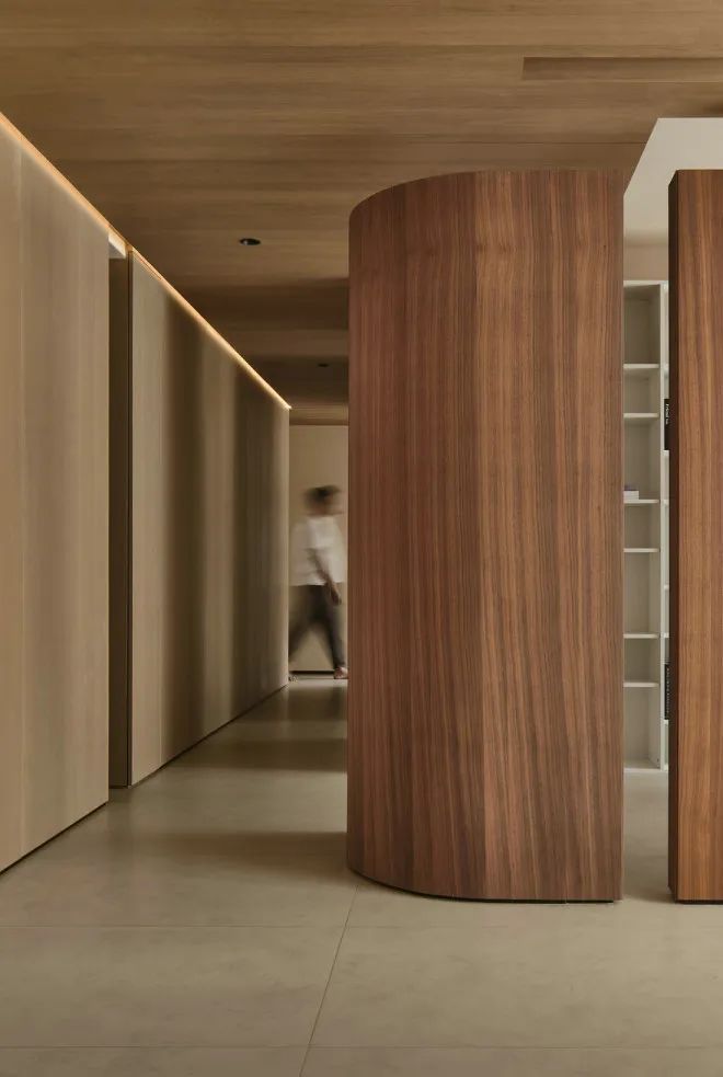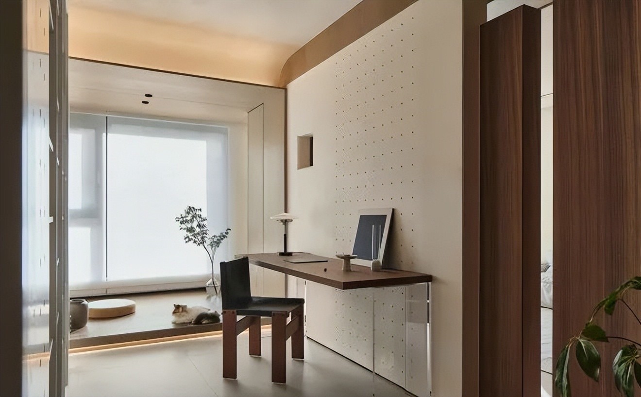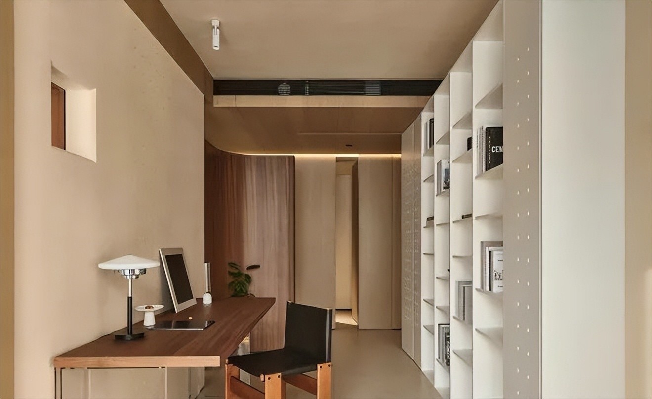 卧室长走廊巧用留白,中间有一段空隙,增加通透感,留给视觉喘息的空间。书房没有采用全封闭设计,是和外界仍相连的半开放式设计,弧形墙让空间有了趣味性的生动。