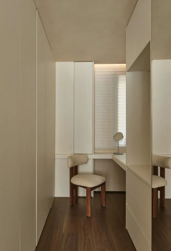 主卧衣帽间收纳空间丰富,定制的悬空梳妆台,门口的柜门做成了穿戴镜,设计实现了夫妻俩更理想的生活状态。