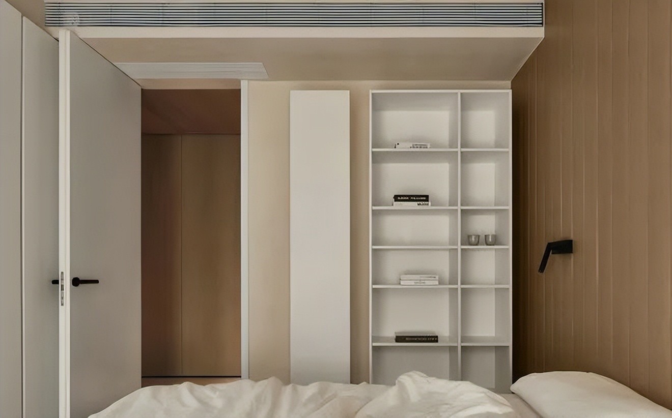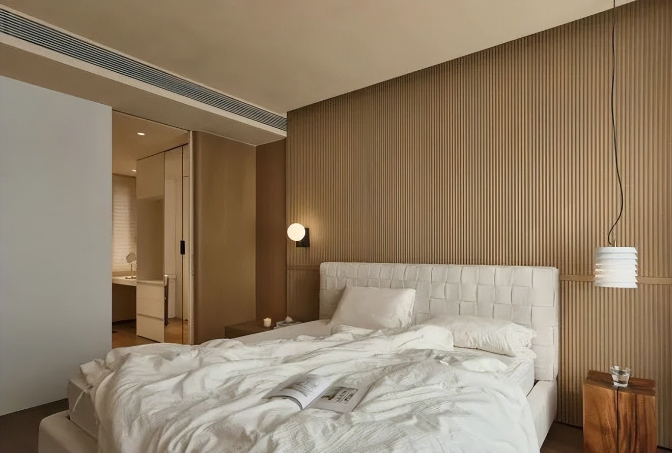 主卧整体素雅自然,床头采用了全铺的木格栅,与客厅茶几相呼应的木块造型床头柜,白色的床品让整个卧室充满舒适的睡眠氛围。梁先生为太太将原卫生间改为了衣帽间,以供日常使用。