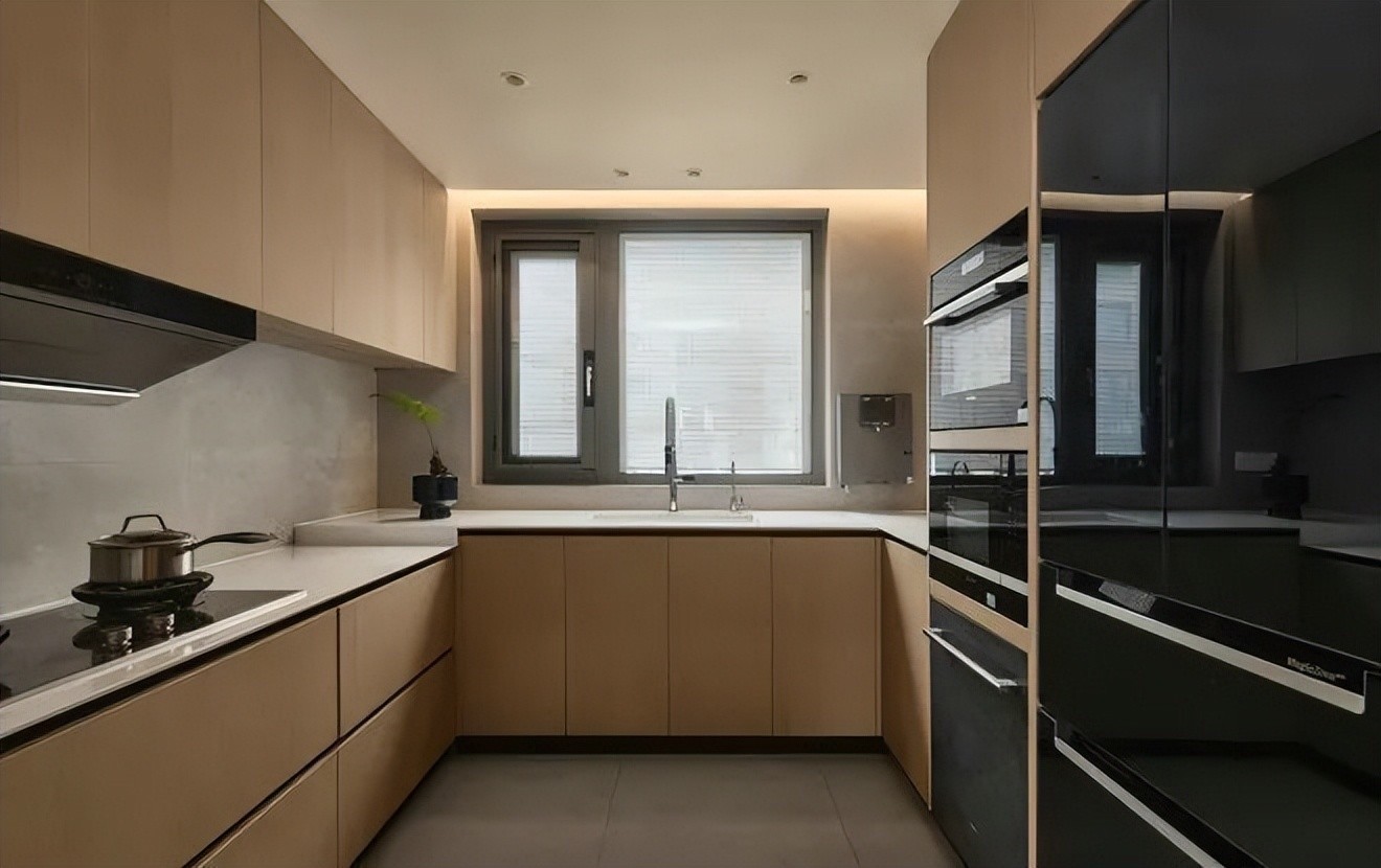 U型厨房实用性强,操作区域动线合理,内嵌式家电腾出大量台面空间,黑色与原木色的搭配,整体视觉上整洁清爽。